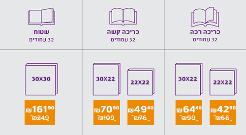 לבחירתכם הגדה עומדת או פורמט ריבועי, כריכה רכה או קשה